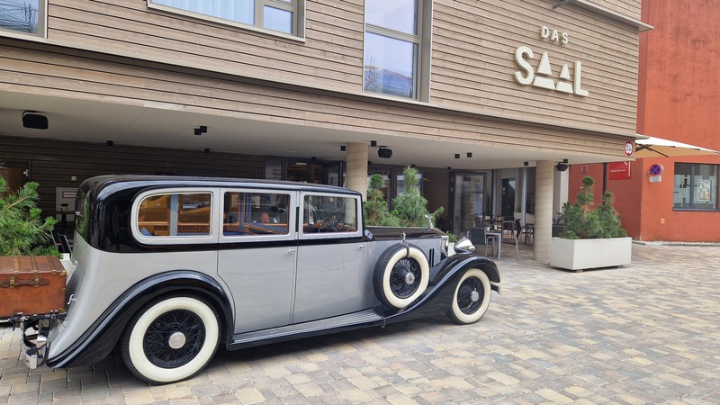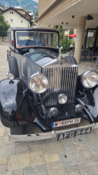 Der Rolls Royce Oldtimer Fan und Besitzer von drei Rolls Royce hat auf seinen 1928 er RR das Logo seines Hotels dezent aufbringen lassen.