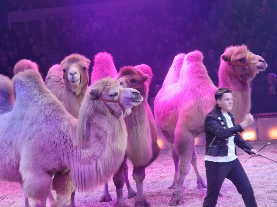 Die weißen Kamele agieren in einer eindrucksvollen Prozession rund um die Manege. In einem prachtvollen Defilee mit reichlich Sägemehl bieten sie ein Dressur-Potpourri allererster Güte. Applaus für ein tolles Bild wippender Höcker und wolliger Winterschönheiten im Banne der Manege.