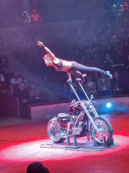 Mit atemberaubender Ruhe erhebt sie sich in den Handstand – nicht auf festem Boden, sondern auf einem Motorrad, das ihr zur Bühne, zum Partner und zum Balancepunkt wird.