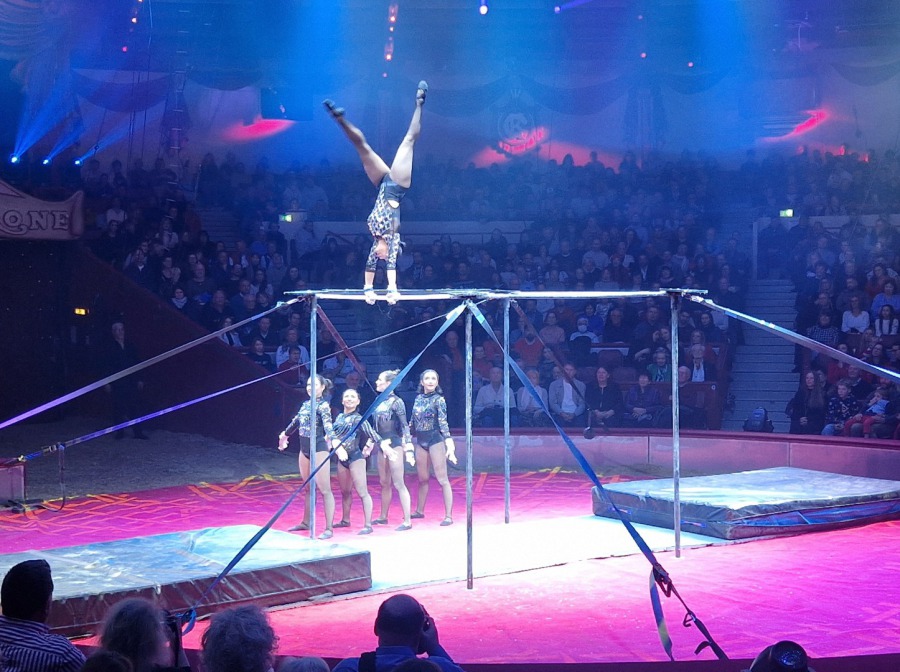 Die sechs ehemaligen Spitzen-Kunstturnerinnen aus Russland, Kuba, Kolumbien und Mexiko waren international gefeierte Leistungssportlerinnen. Truppenchefin Natalia Kapitonova, Olympiateilnehmerin 2016 in Rio und Europameisterin 2019, führt die „Wirbelwinde“ nun zu neuen Höhen im Circushimmel. Standing Ovations garantiert.