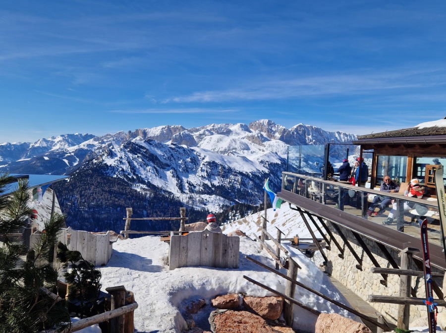 Von Canazei führen moderne Liftanlagen direkt in das Skigebiet Belvedere – Sass Pordoi, eines der schönsten Panorama-Gebiete der Dolomiten. Besonders spektakulär ist der Blick von der Bergstation am Sass Pordoi, der oft als „Terrasse der Dolomiten“ bezeichnet wird.