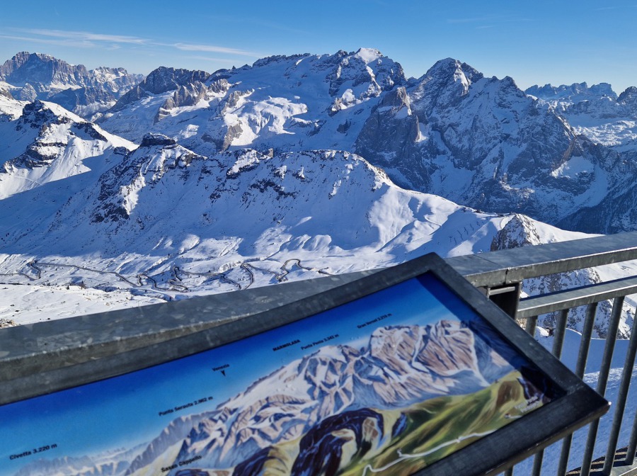 den Panoramabergen rund um Sass Pordoi und Marmolada