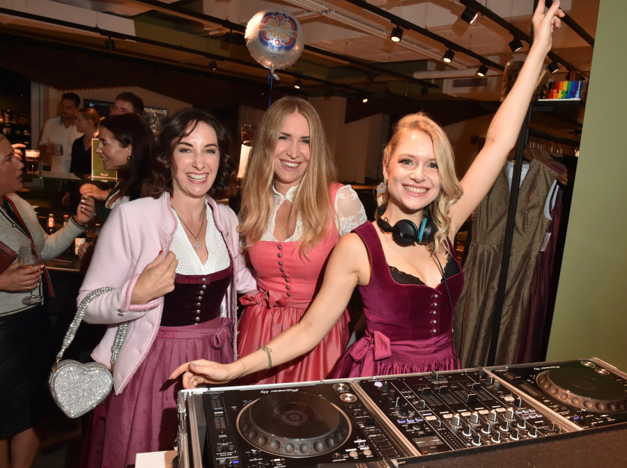 Dann sorgte Sandra Greiner alias S.A.N.D.Y, die Frau von Gastgeber Christian Greiner, an den Turntables für Partystimmung und spielte Disco und House, aber auch Wiesnhits: „Ich freue mich auf eine herrliche Wiesn und jetzt kann es losgehen.“ Sie trug ein Dirndl in der angesagten Farbe Berry, verzichtete aber auf eine Dirndlbluse: „Als DJ darf man sich ein wenig abheben, ansonsten bin ich durchaus Blusenfan bei der Tracht. Und bei den Farben liebe ich, als Blondine, kräftigere Töne so wie heute, mag aber auch gerne schwarze Dirndl.“